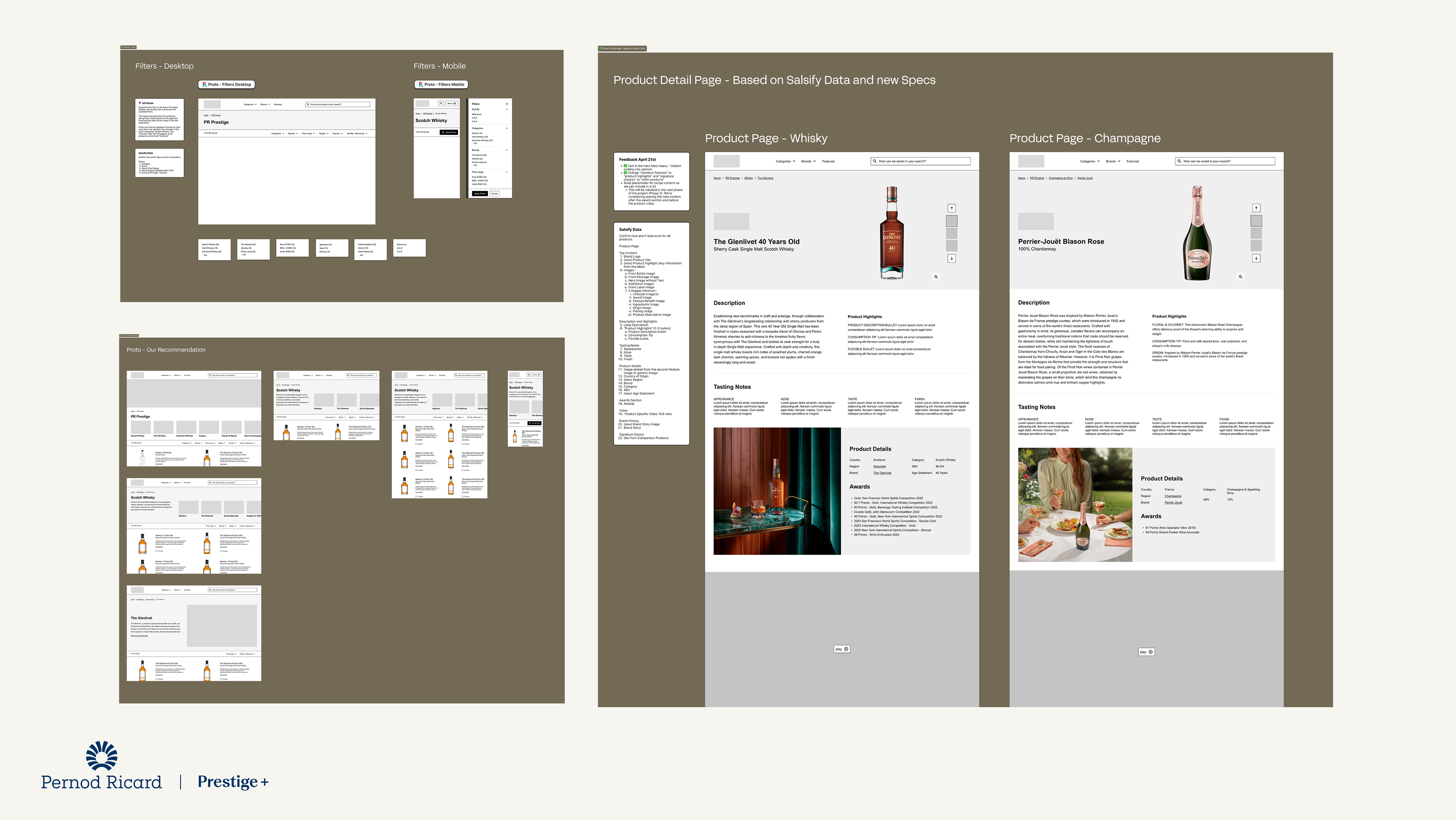 Mon rôle en UX a été d’établir la vision pour toutes les pages sous forme de wireframes : la page d’accueil, la navigation, les listes de produits, la comparaison et la page produit. Tout a été conçu et prototypé afin de définir l’expérience complète. Un aspect distinctif de ce projet : toute l’information produit provient de Salsify, un PIM (Product Information Management). Cela permet aux équipes de Pernod Ricard de centraliser les données et d’éviter la saisie manuelle. J’ai contribué à définir quelles informations existaient déjà dans Salsify et quels nouveaux champs devaient être créés.