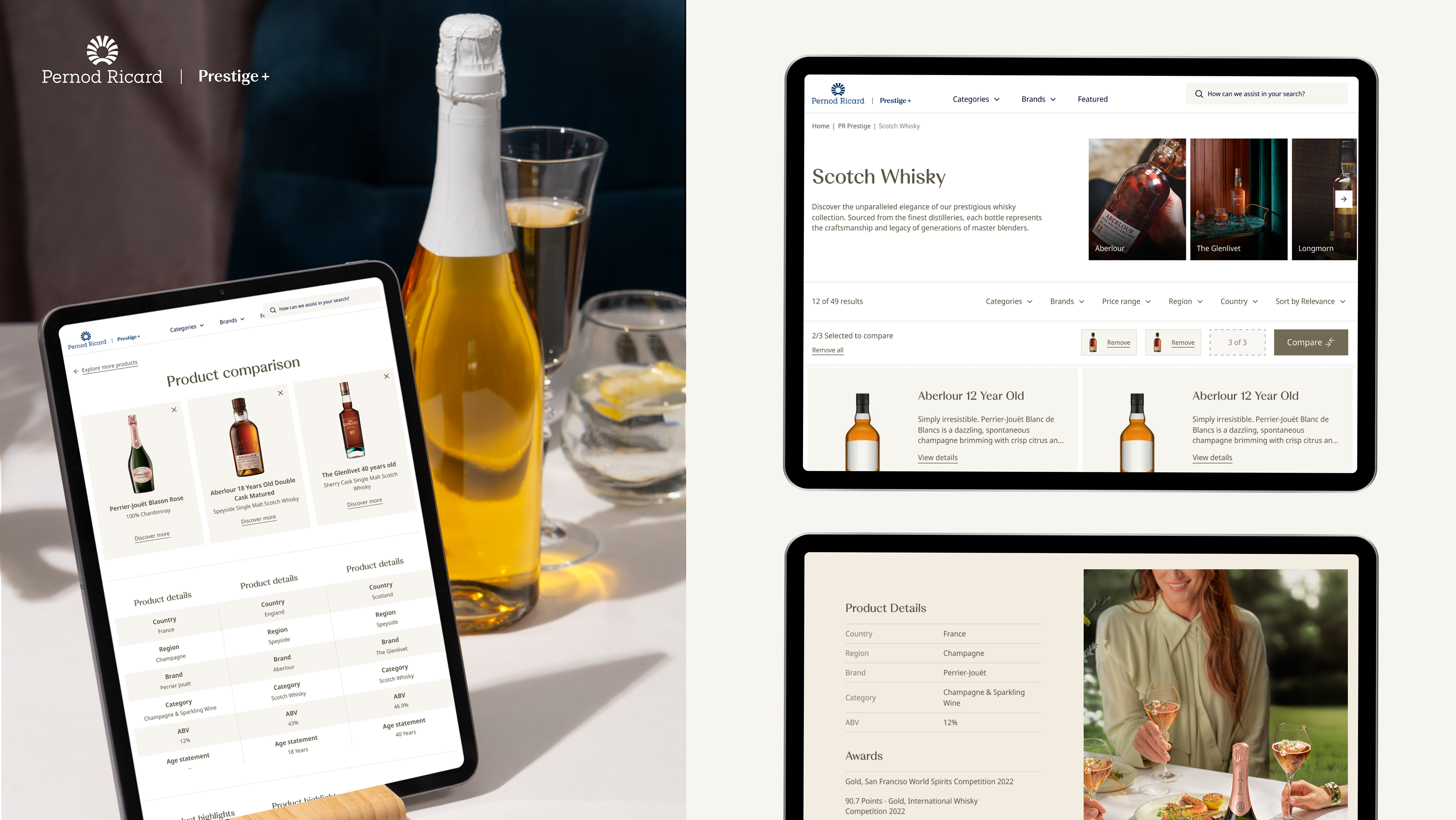 Finalement, le projet de catalogue prestige de Pernod Ricard. Ce projet était particulièrement intéressant car il s’adressait à un auditoire B2B : des conseillers en magasin. L’objectif était de leur offrir un outil premium pour mieux connaître les produits Prestige de Pernod Ricard, les comparer et partager cette connaissance avec leur clientèle.